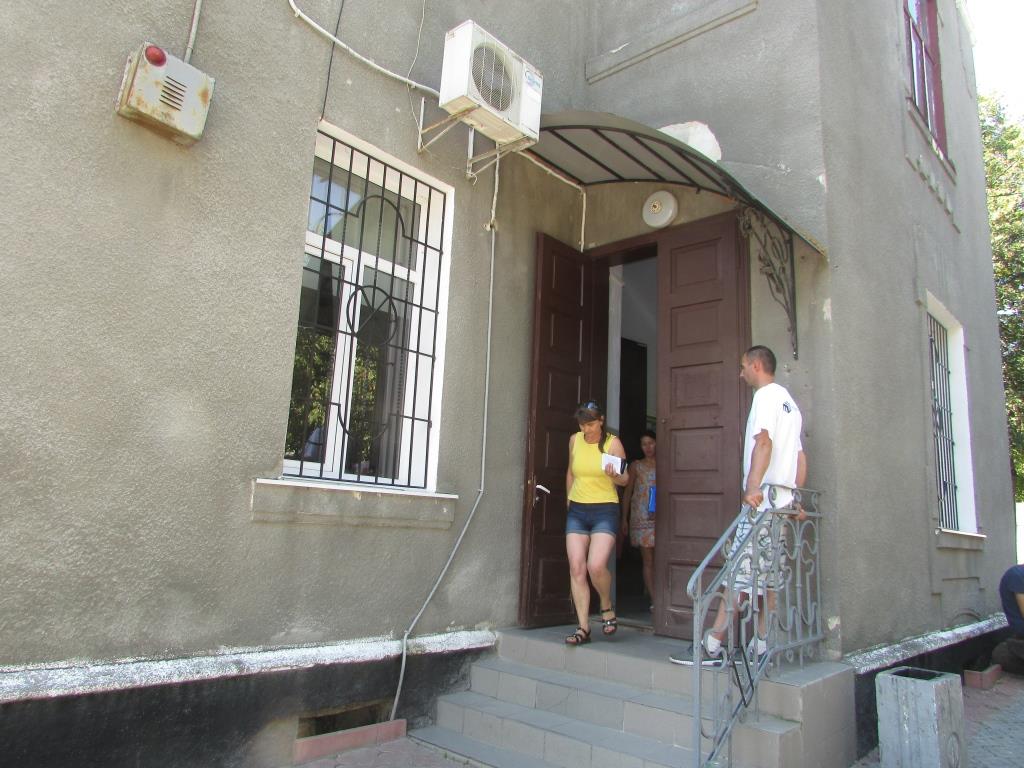 Після 14-ї години стає спекотніше. Вже о 15-й ще більше людей. Біля дверей – жінка з чотиримісячною дівчинкою. Вона тут з 11-ї. Щогодини дає дитині груди. Ніхто з присутніх не пропускає її поза чергою.