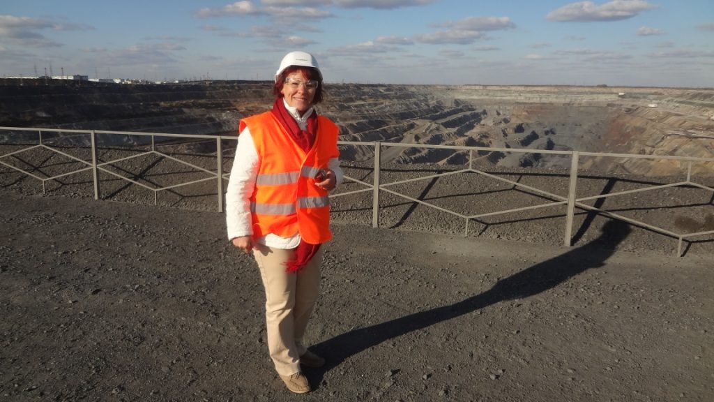 Торкаюся чорнеьких кристалів. Відчуття дотику до вічності. Вдивляюся у  багатошаровість  кратера. Світліше, темніше, ширше, вужче. Згадала побажання про те, що коли ви на світлій смужці, то йдіть не впоперек, а вздовж… Вздовж тут ідуть важковаговики. Два іграшкові крокуючі екскаватори  там десь внизу безшумно  працюють, звуків тут не чути через  відстані. А щоб досягти темно-сірої смужки залізної руди, за словами нашого екскурсовода промислового туризму, технічного заступника  директора ГЗК  Віктора Олюха, довелося зняти 71 метр піску-глини-піску.   А перед цим заскладували гумус. Про рекультивацію ще не йдеться, бо експлуатують це родовище лише 10 років. Неосяжна вирва  бентежить цифрами, які не відразу можеш збагнути. У перспективі тут буде котлован, за словами технічного консультанта,  до 4,5 кілометра  довжини, завширшки  – 2,5 кілометра.