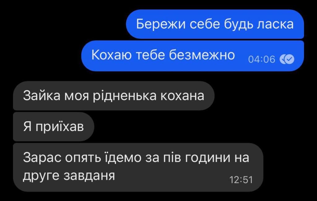 В обід третього липня Олександр написав дружині, що приїхав із завдання. Останнє його повідомлення: «Зайка, моя рідненька. Кохана, я приїхав. Зараз знову за пів години їдемо на друге завдання».