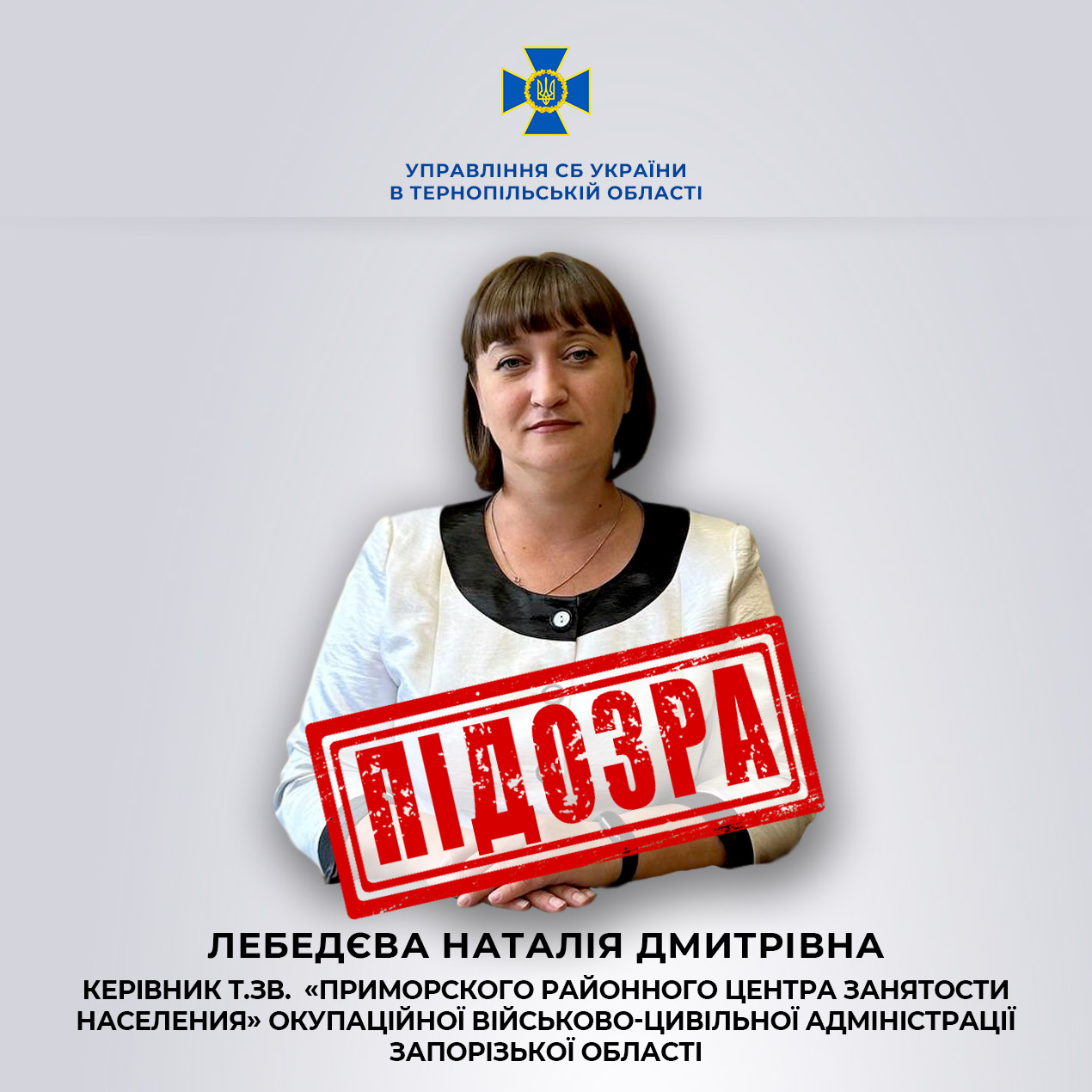 Під час досудового розслідування встановлено, що на цій посаді колаборантка виконувала організаційно-розпорядчі та адміністративно-господарські функції у незаконних органах влади, а також допомагала окупантам реалізовувати ворожу політику у сфері регулювання зайнятості місцевого населення.