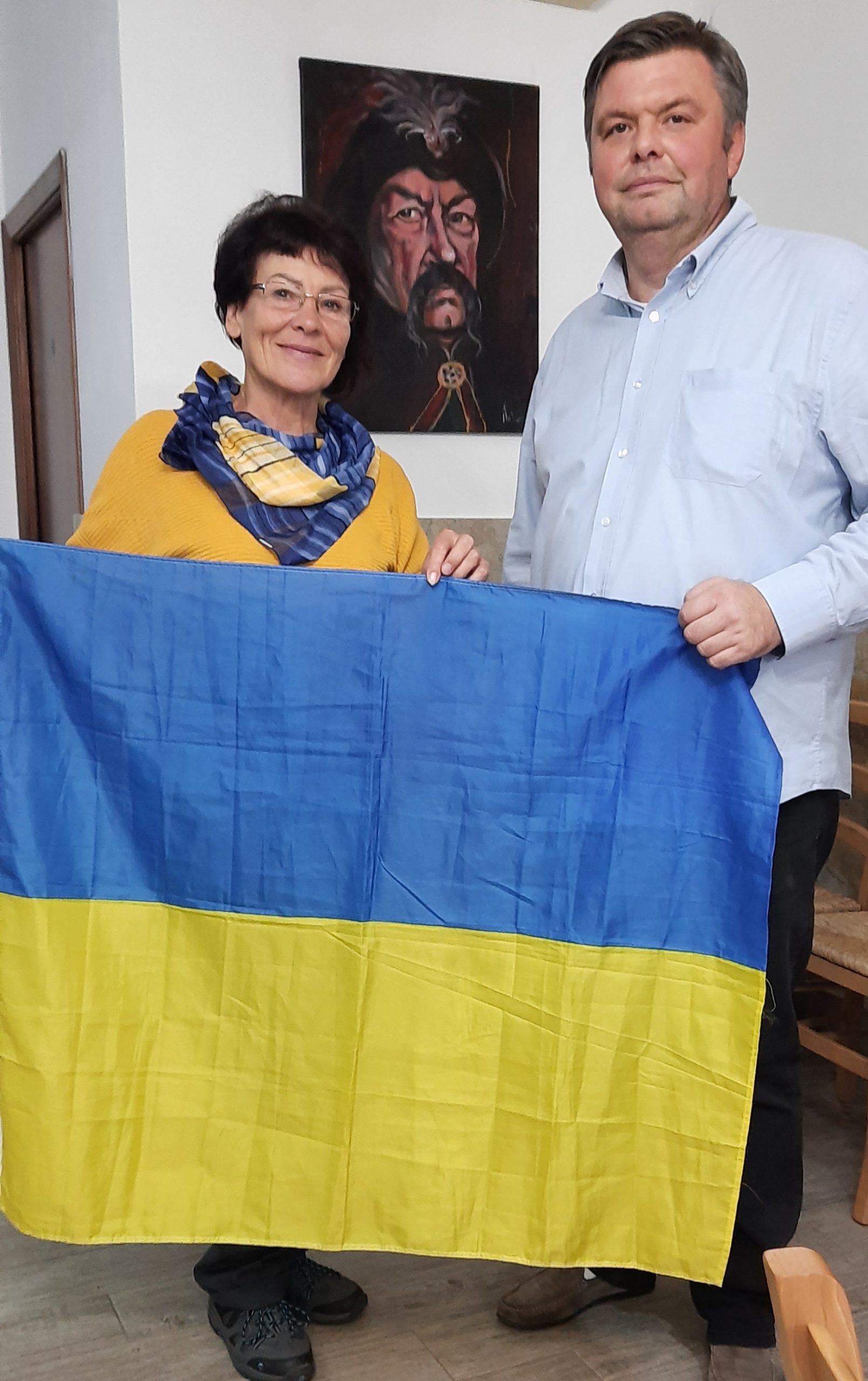 – У Миколи в Римі була виставка  «Паралельні світи», на якій було понад тридцять живописних робіт, – розповідає Олесь. – Загалом його творчий доробок  налічує близько 100 картин. Останні 2 роки з-під пензля художника з’явилися десятки портретів відомих українських особистостей, які вплинули на історію держави. Всі вони виконані на шкірі спеціальними авторськими фарбами. Виставка була благодійною, зібрані кошти автор передав  на потреби Збройних Сил України. Окрім основної роботи як дизайнера одягу (шкіра та хутро), а останніми роками і як художника, Микола Струс від початку війни на сході України є волонтером спільноти «Серце Лева» у рідному Львові, співпрацює з волонтерами з Берліна тепер і з нами. Три картини з колекції митця   дісталися нам: портрет провідника ОУН  Степана Бандери, княгині Ольги і гетьмана Богдана Хмельницького. Відвідувачі  запитують, хто зображений на полотнах, і в нас є ще одна можливість розповісти про Україну, сторінки її історії. Не забуваємо нагадати, що Степана Бандеру, який народився у 1909 році і був  автором  Акта відновлення Української Держави 30 червня 1941 року, і досі москалі шукають в Україні, щоб покарати за українськість і любов до своєї батьківщини. Хоч тепер уже вся Україна стала для ворогів  бандерівцями, тому і чинять геноцид на нашій землі, бо знають, що ми пишаємося цим званням. Ми і незламні, бо  бандерівського замісу, – каже Олесь.