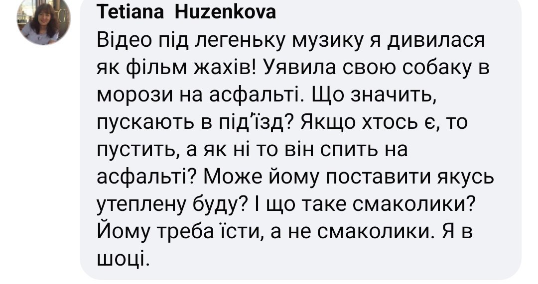 «За песиком доглядає моя мама, їй 70 років. Він живе в одному з під’їздів поблизу театру. Спить у теплі і в набагато комфортніших умовах, ніж у будці. Кожен вечір вона йде і забирає його. Там він спить на м’якому дивані, який сусіди винесли в коридор спеціально для нього. Їжа та водичка в мисочці є завжди», — ділиться Наталія.
