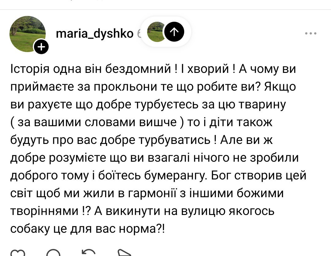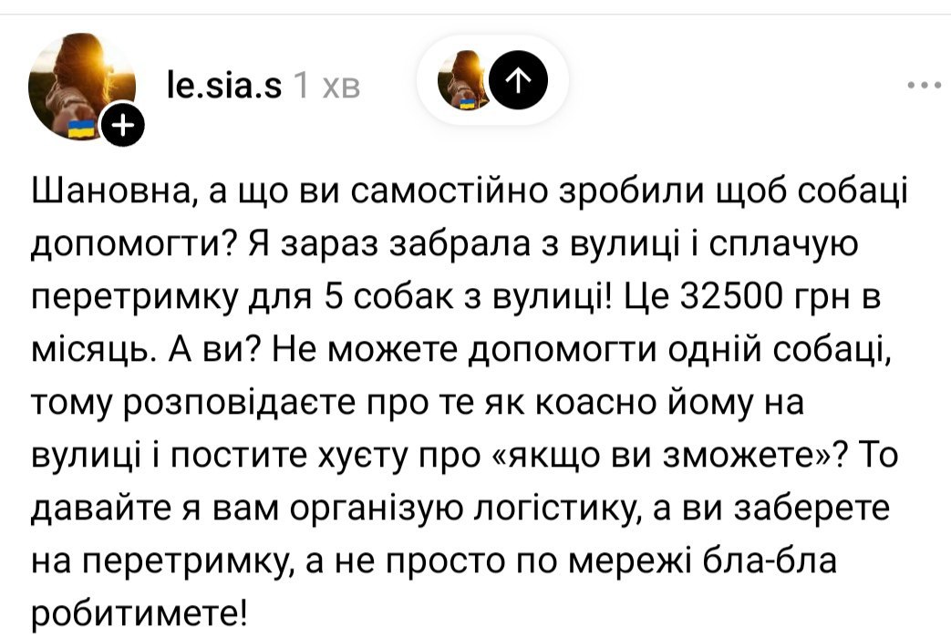 Але найагресивніший табір висуває ультиматуми: або ти платиш десятки тисяч гривень за перетримку, як це робить Леся, або усе — це лише «бла-бла» та «х*єта». Звинувачували у відсутності серця, лякали і розмахували «божими бумерангами» за те, якщо дозволити псу залишатися собою.