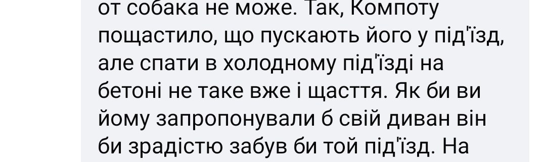 Коментатори припускають, що Компот „з радістю забув би під’їзд“, якби йому запропонували диван замість бетону. Сюрприз: у нього вже давно є диван у під’їзді, де він спить щоночі.
