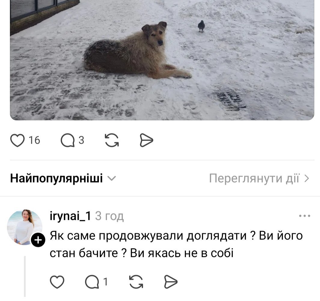 Кажуть, відео зі спокійним псом серед снігів дивилися як „фільм жахів“. Що ж, ласкаво просимо до другої серії: Компот і голуби. Триллер про те, як собака 10 років поспіль відмовляється грати роль жертви, бо він тут — головний режисер. Спойлер: у фіналі він піде до теплого під’їзду на свій диван, поки глядачі писатимуть третій сезон коментарів про “асфальт”.